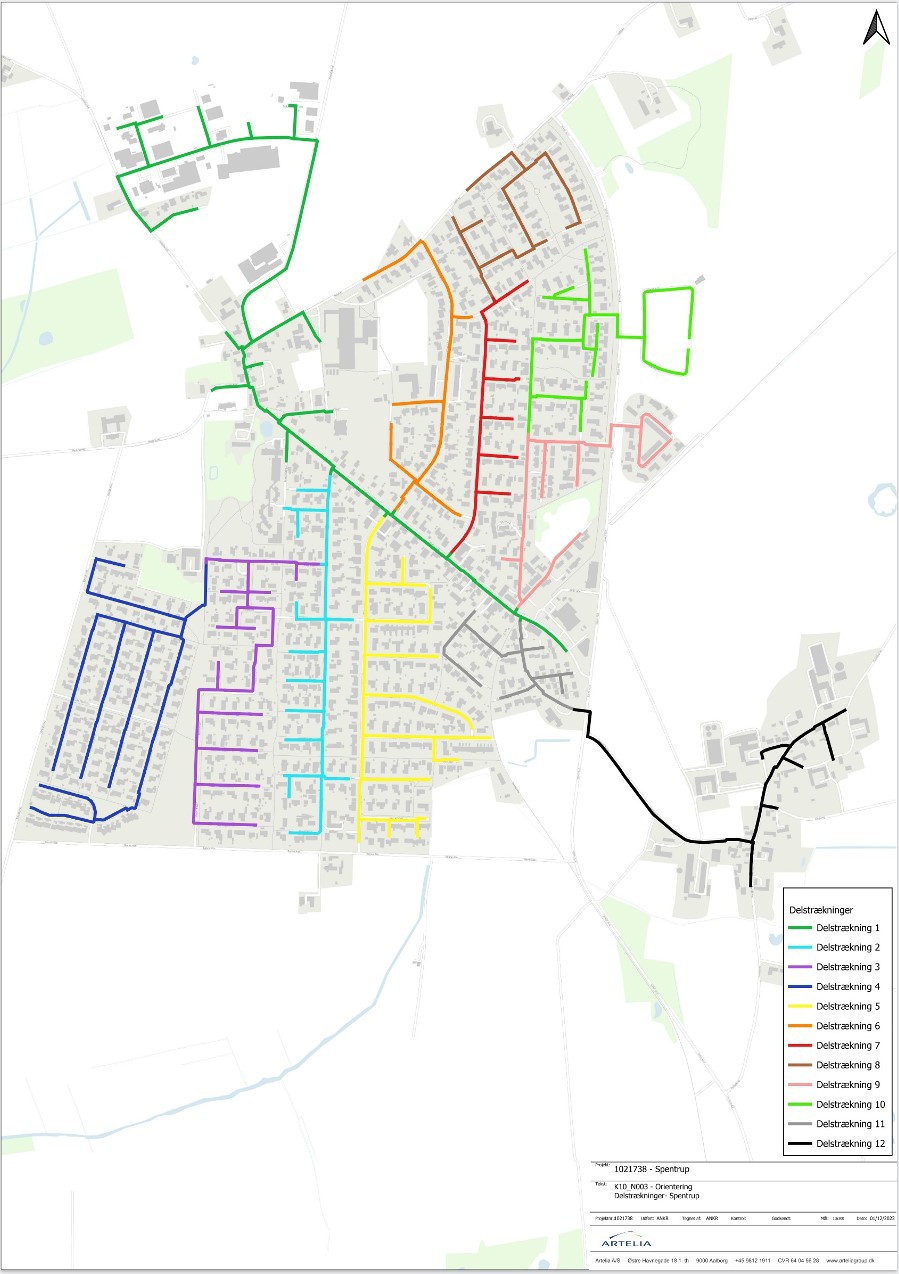 Strækningerne der kan bydes ind på, er imellem 1.000 og 3.100 meter kanal, og er en blanding imellem stikledninger, hovedledninger i plast og hovedledninger i stål. Se også kort nedenfor, hver strækning er markeret med sin egen farve. Overordnet har vi forsøgt at udarbejde et udbud med nok detaljer til at kunne afgive en pris pr. meter kanal, men stadig så mængden af kontrol og dokumenter i udførelsen ikke er alt for omstændigt.